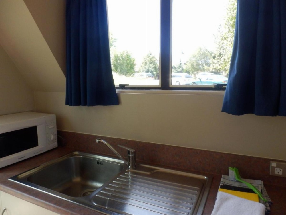 This studio features a kitchenette with a refrigerator, microwave, kitchenware, a small oven and a stovetop. It also includes a flat-screen TV and a washing machine.